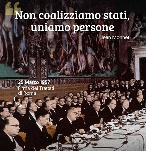 Konrad Adenauer, il 25 marzo 1957, nel suo discorso in occasione dei Trattati istitutivi della CEE e della CEEA, dichiarò: “Fino a poco tempo fa, molti erano coloro che consideravano irrealizzabile l’accordo che oggi consacriamo ufficialmente (…). Sappiamo quanto sia grave la nostra situazione, che può trovare una soluzione soltanto con l’unificazione dell’Europa; sappiamo anche che i nostri progetti non sono egoistici, ma mirano a promuovere il benessere del mondo intero. La Comunità europea persegue esclusivamente fini pacifici e non è diretta contro nessuno (…). Il nostro obiettivo è collaborare con tutti per promuovere il progresso nella pace”.